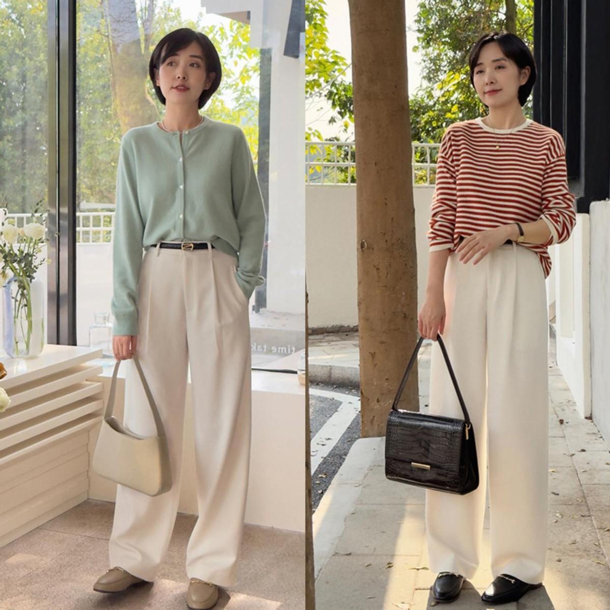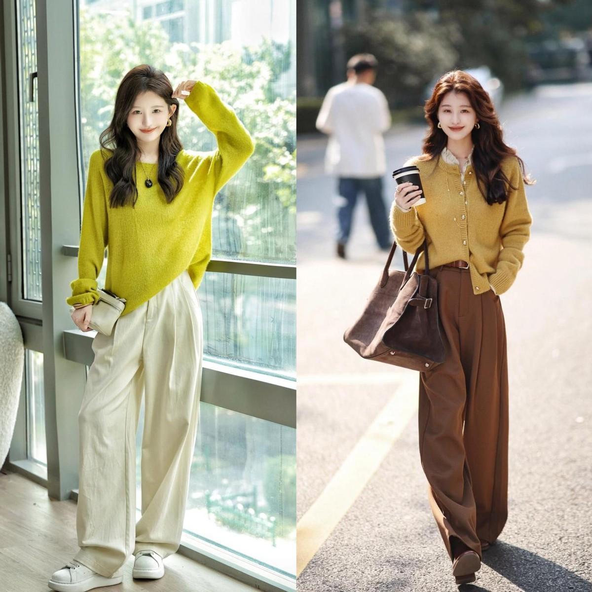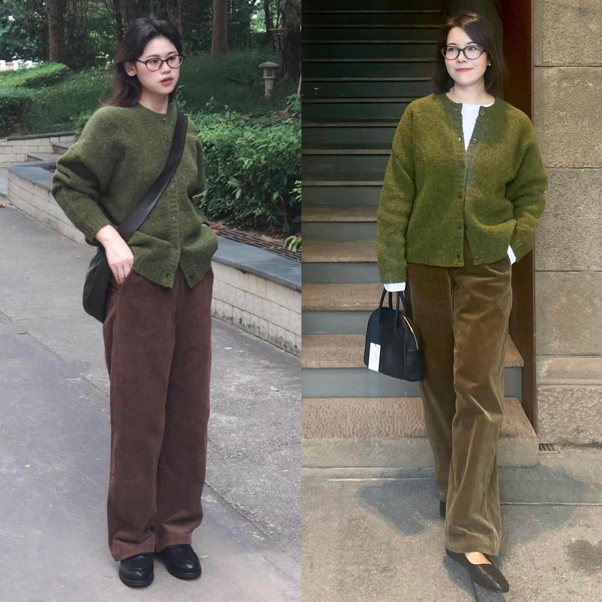 復舊的綠色真摯衫搭配棕色的闊腿褲,配色復舊知性,深色系的搭配視覺上顯瘦后果可以,而這種低亮度的單品也不挑膚色,白皮膚的女東說念主穿會更顯白哦。