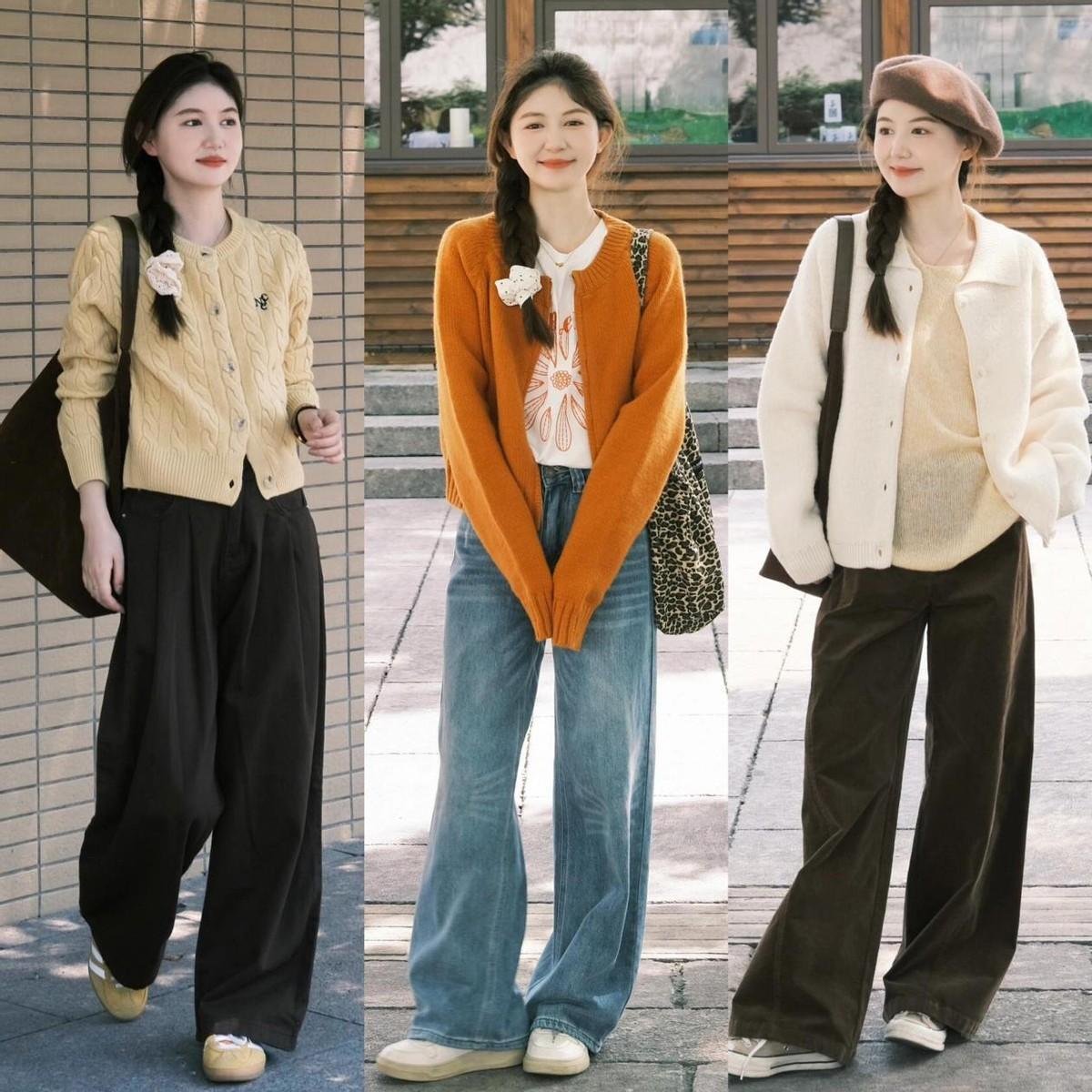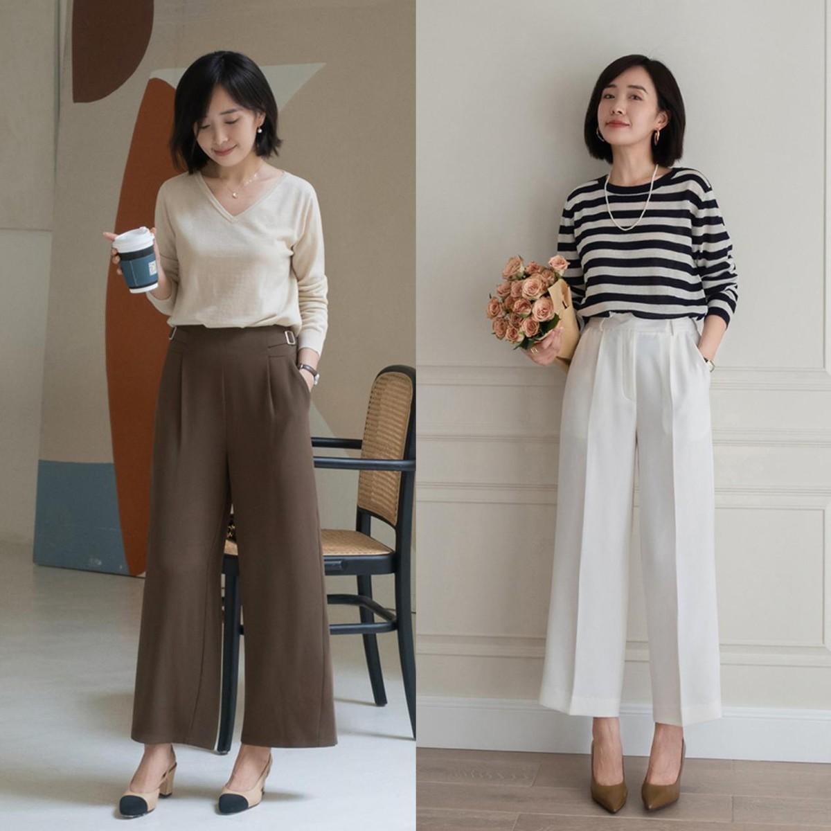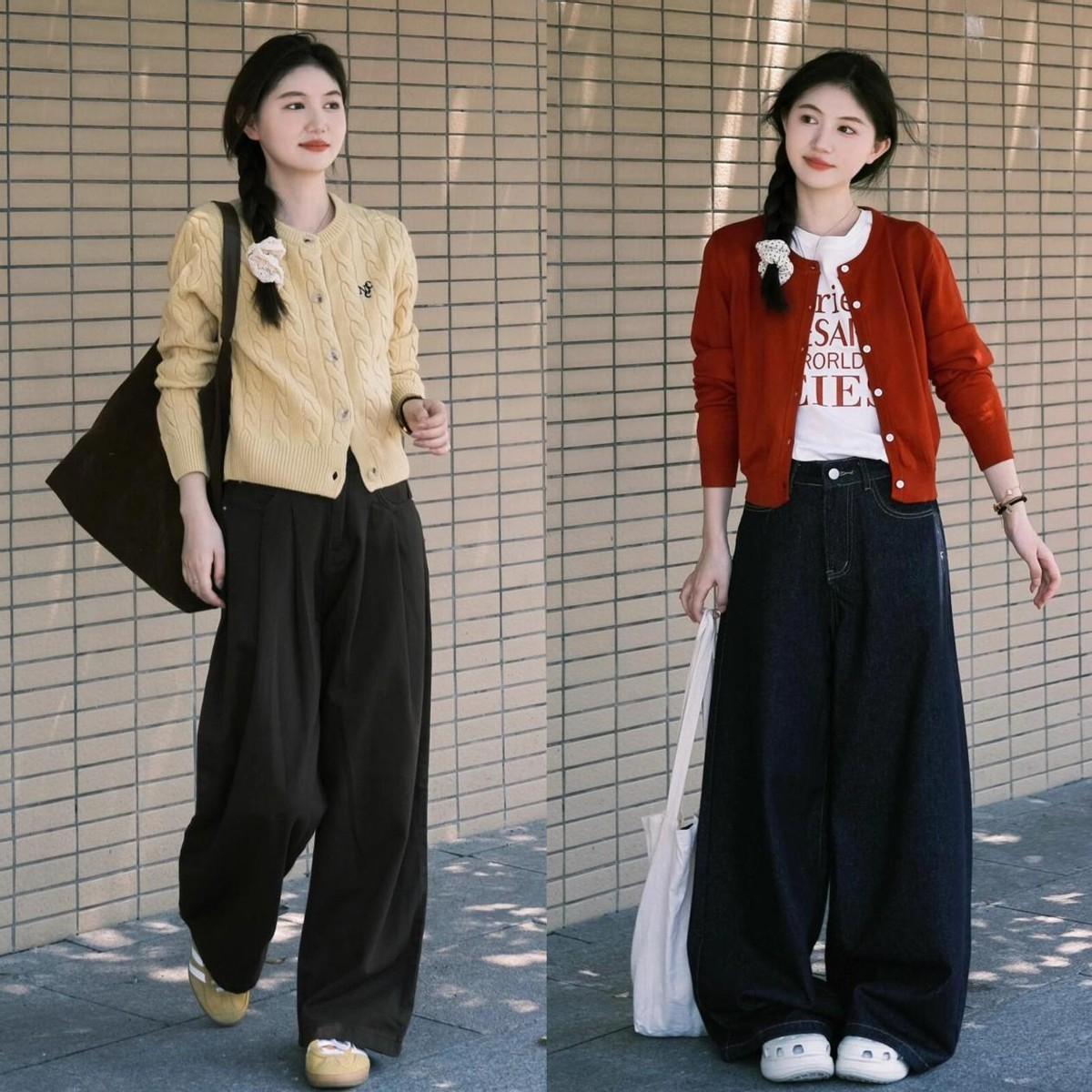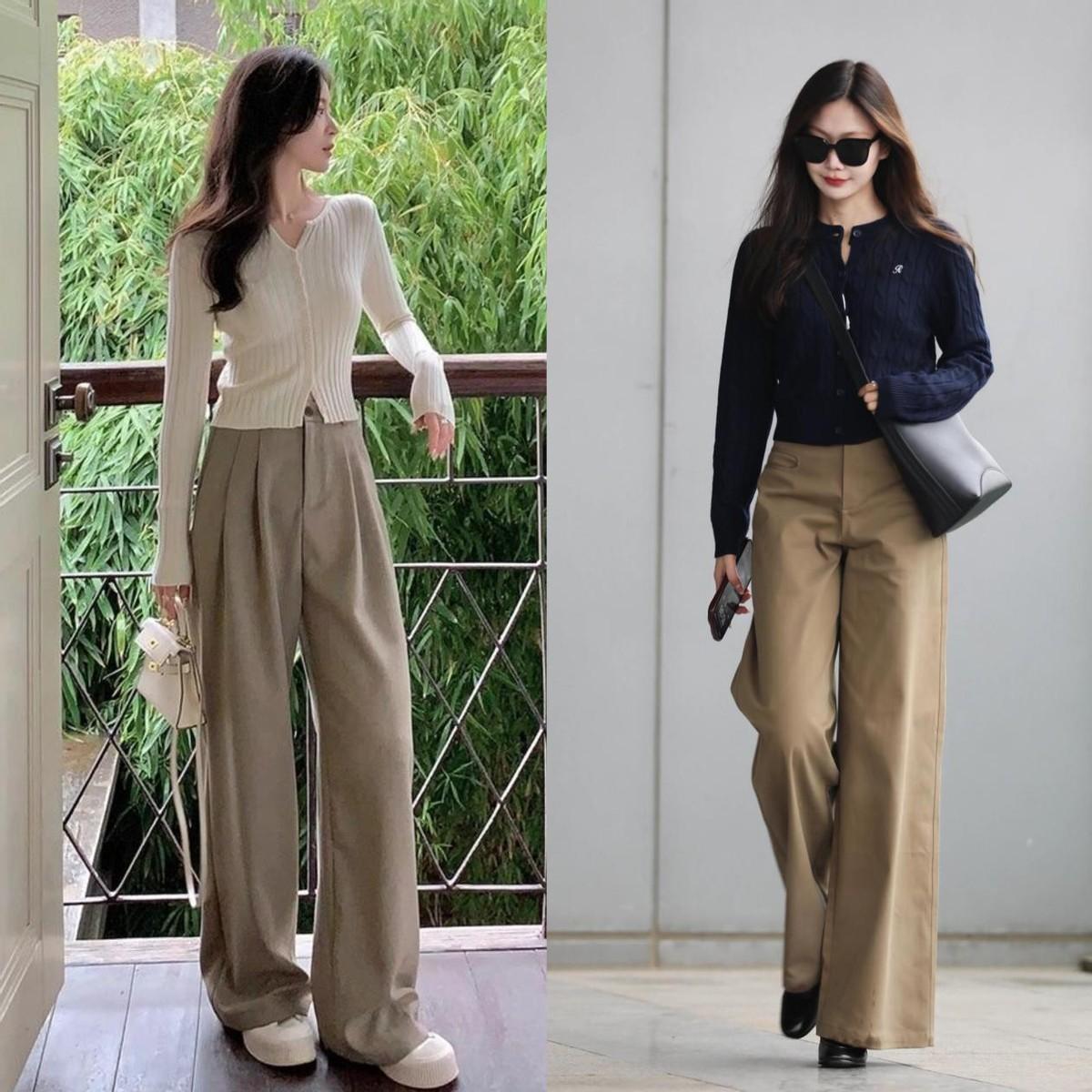 復舊的綠色真摯衫搭配棕色的闊腿褲,配色復舊知性,深色系的搭配視覺上顯瘦后果可以,而這種低亮度的單品也不挑膚色,白皮膚的女東說念主穿會更顯白哦。