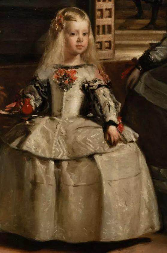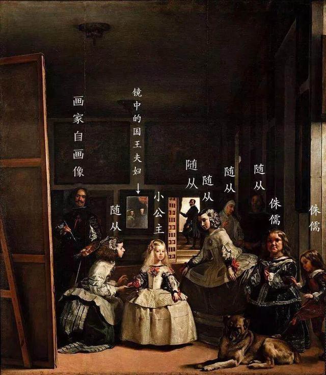 這幅畫中有四個主角,一個是小公主,因為她處在畫中心;第二和第三是國王夫人,誠然他們莫得出當今畫中,但這幅畫本人即是為他們所作。第四個主角是門外的隨從,因為惟有借助他的視角,咱們智力夠看到國王夫人,隨從是這幅畫的視角相干中不成或缺的一員。