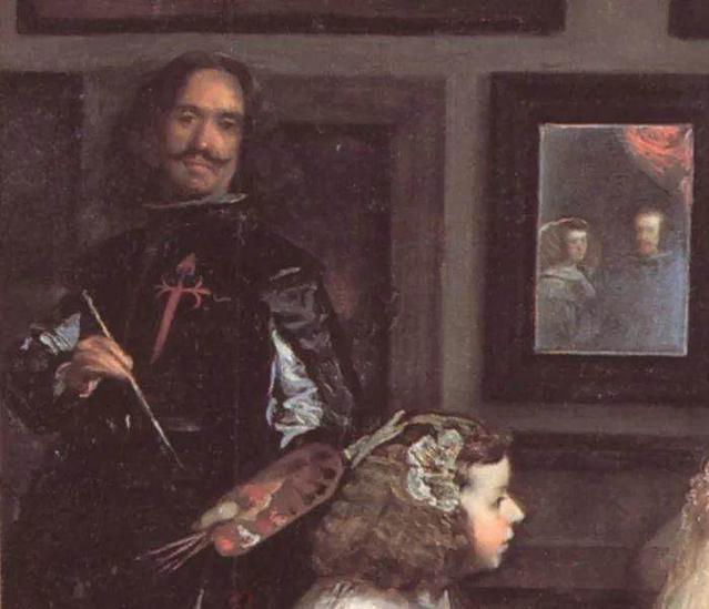 畫左邊手中拿著畫筆的即是畫家本東談主,咱們再持續不雅察配景,背面有一面鏡子,鏡子中映出了兩個東談主,是西班牙國王菲利浦四世和第二任王后瑪麗安娜,這幅畫即是國王交付畫家所作,畫中并莫得出現國王與王后,其實他們就站在小公主對面,鏡子反射出他們疲塌的影子。